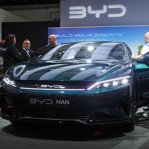 1月13日,人們在比利時(shí)布魯塞爾車(chē)展媒體開(kāi)放日上參觀(guān)比亞迪漢電動(dòng)汽車(chē)。