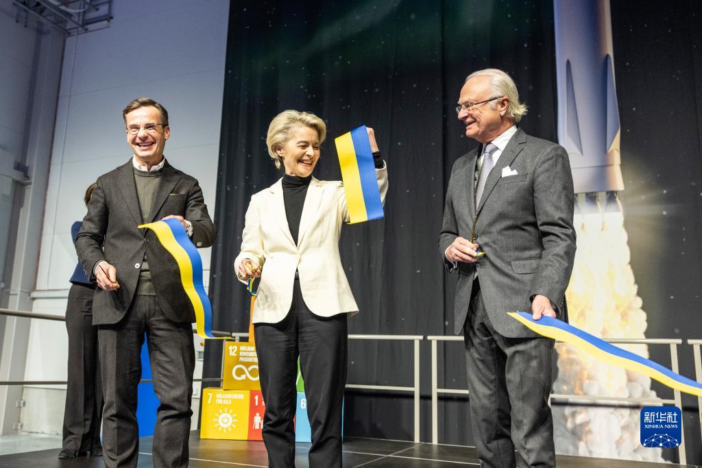 1月13日,在瑞典北部城市基律納,瑞典國王卡爾十六世·古斯塔夫(右)、瑞典首相克里斯特松(左)與到訪(fǎng)的歐盟委員會(huì )主席馮德萊恩(中)出席航天港落成典禮并剪彩。