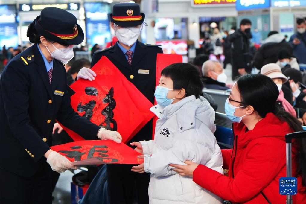 1月14日,天津站工作人員在候車(chē)大廳為旅客送上福字。