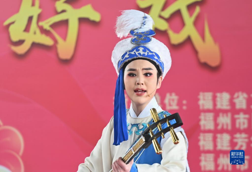 1月14日,福建芳華越劇院演員在福州市烏龍江公園表演節目。