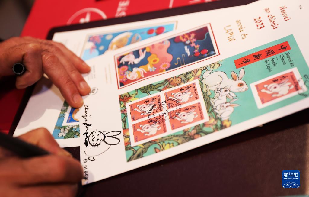 1月14日,在法國巴黎舉行的兔年生肖郵票發(fā)行儀式上,郵票設計者陳江洪為集郵愛(ài)好者簽售兔年生肖紀念郵票。