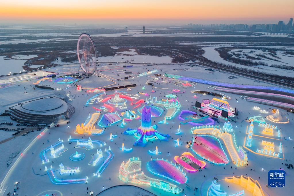 1月3日拍攝的夕陽(yáng)下的哈爾濱冰雪大世界園區(無(wú)人機照片)。