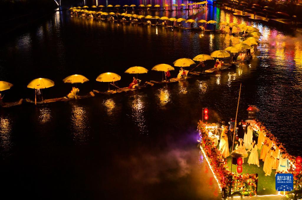 當日,在湖北省恩施土家族苗族自治州宣恩縣貢水河上,一場(chǎng)“貢水游龍”迎新春活動(dòng)吸引不少市民游客參與體驗?!柏曀锡垺庇蓴凳畻l竹筏作“龍身”,輔以燈光、音樂(lè ),人們可以在貢水河上“乘龍”觀(guān)賞璀璨夜景,歡樂(lè )迎新春。