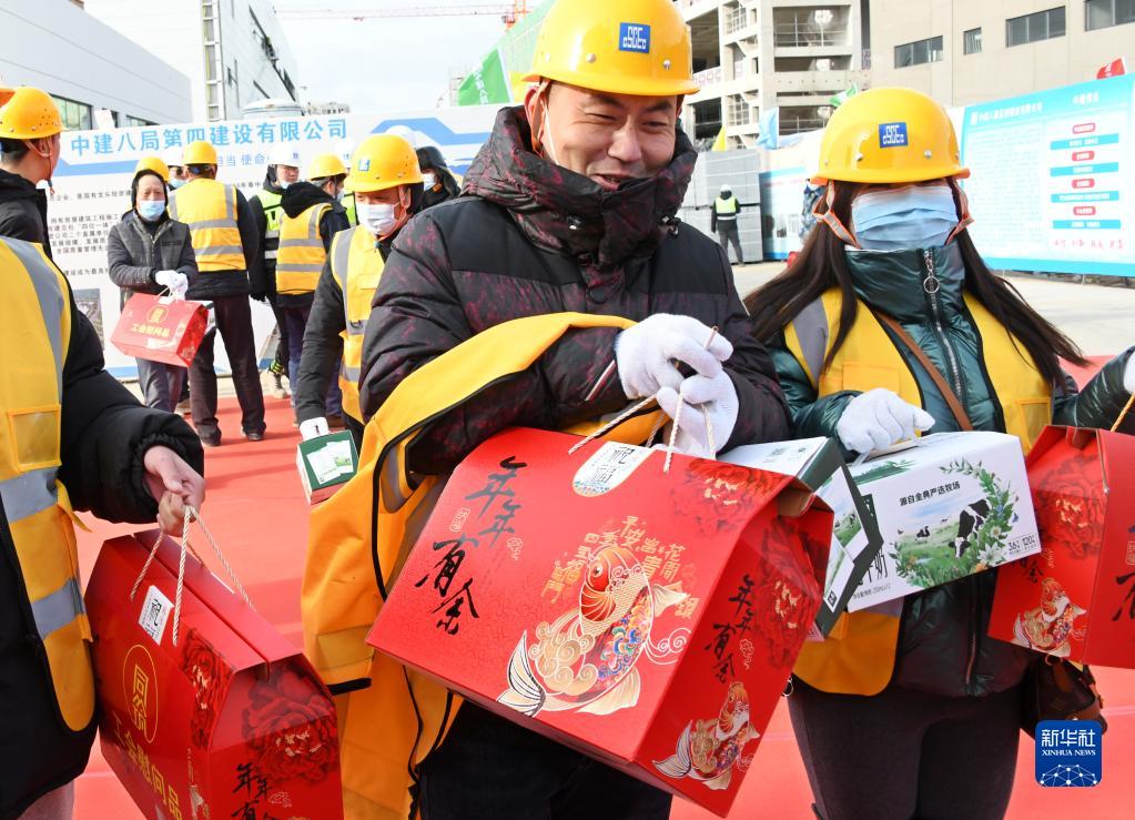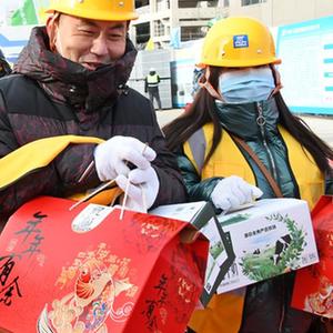 1月15日,青島虛擬現實(shí)產(chǎn)業(yè)園施工現場(chǎng),工人在領(lǐng)取春節慰問(wèn)品。