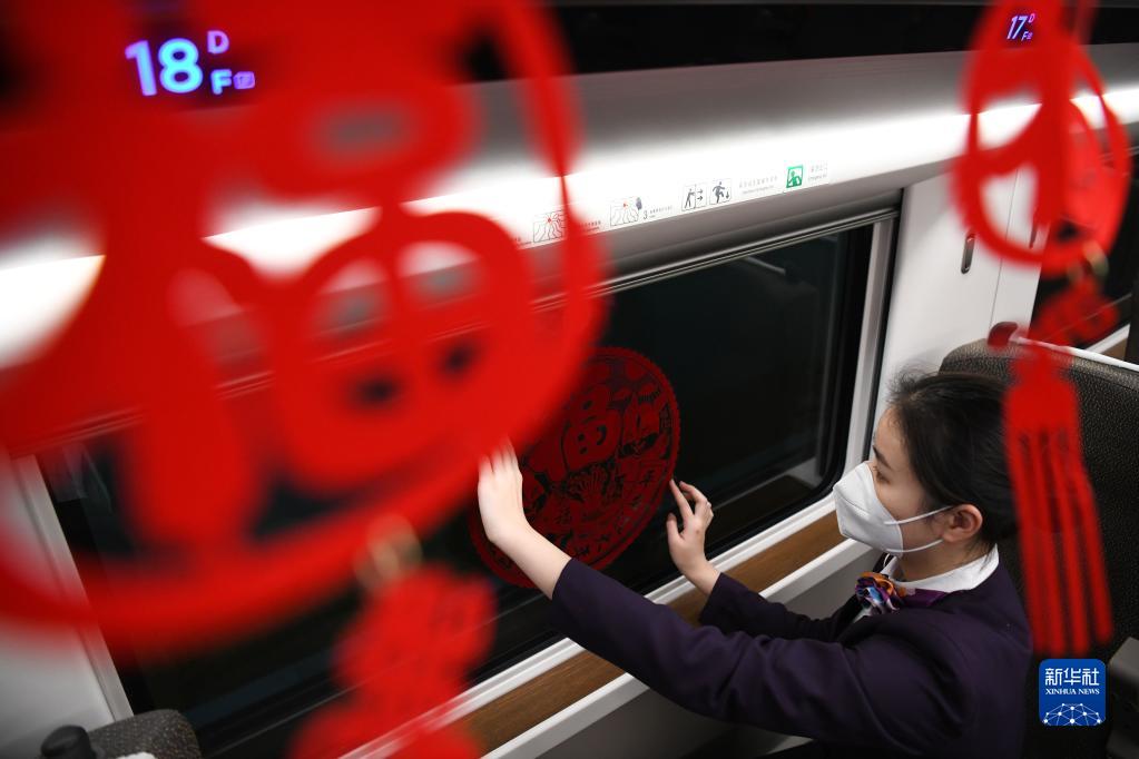 1月13日晚,中國鐵路上海局集團有限公司合肥客運段列車(chē)員王昊在G9480次高鐵列車(chē)開(kāi)行之前布置車(chē)廂。