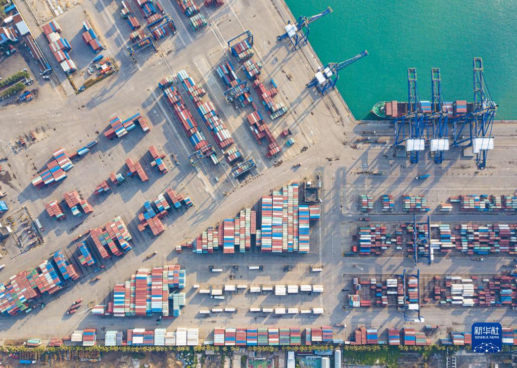 在海南省??谑信臄z的??诟奂b箱碼頭(無(wú)人機照片,1月13日攝)。