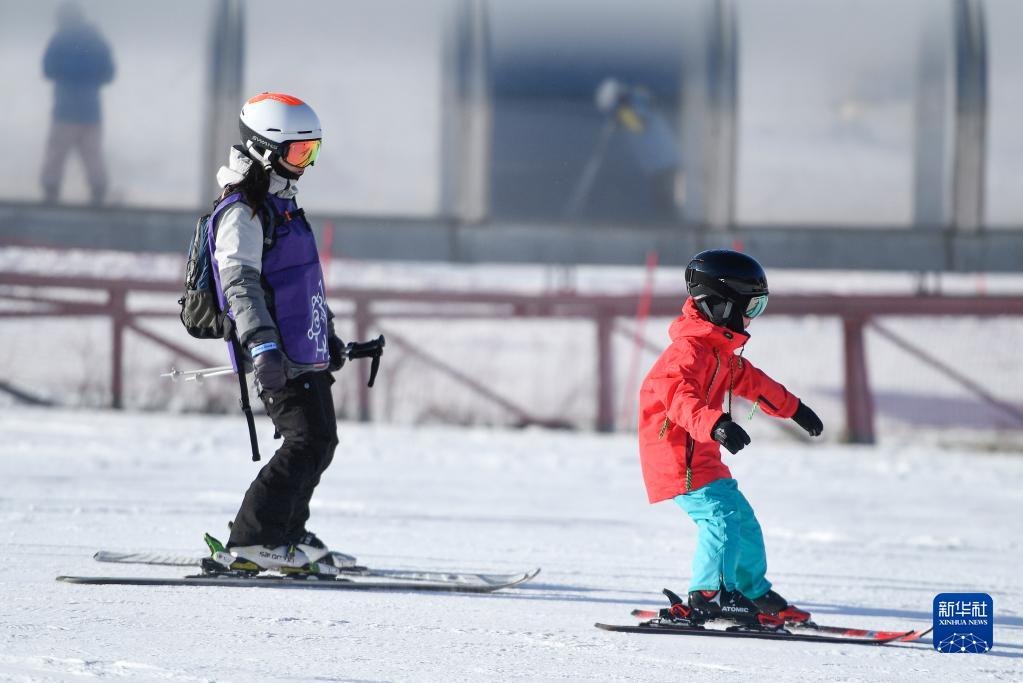 1月15日,一位小朋友(右)在教練的指導下學(xué)習滑雪。