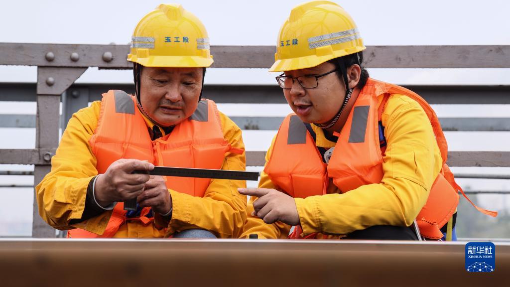 1月14日,在廣西貴港市,陳榮興(左)和陳龍在檢查鐵路郁江橋橋面軌枕。