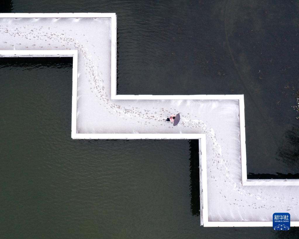1月15日,市民行走在安徽巢湖市洗耳池公園布滿(mǎn)積雪的曲橋上(無(wú)人機照片)。