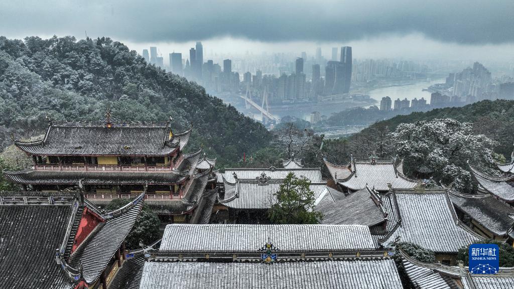 這是1月15日在重慶南岸區涂山寺拍攝的雪景(無(wú)人機照片)。