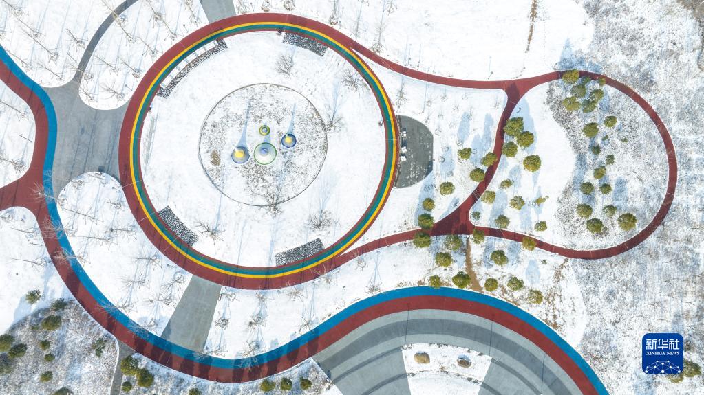 這是1月15日拍攝的湖北省襄陽(yáng)市魚(yú)梁洲環(huán)島景觀(guān)帶雪景(無(wú)人機照片)。