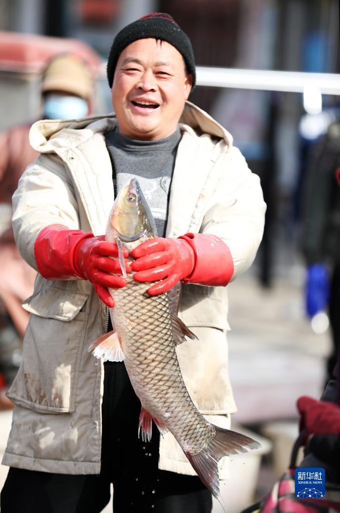 1月15日,在山東省臨沂市郯城縣郯城街道十里年集上,一名攤主在售賣(mài)鮮魚(yú)。