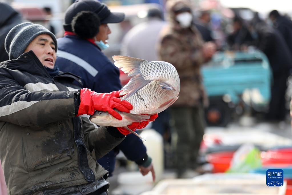 1月15日,在山東省臨沂市郯城縣郯城街道十里年集上,一名攤主在為顧客選取鮮魚(yú)。