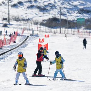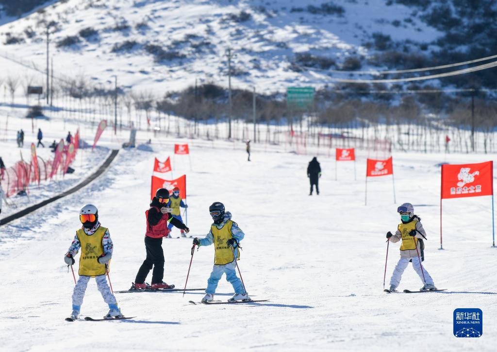 在新疆白云國際滑雪場(chǎng)上,小朋友們跟隨教練學(xué)習滑雪技能(1月13日攝)。