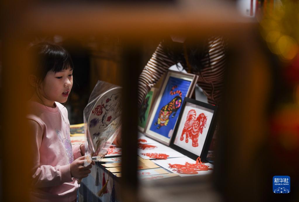 在烏魯木齊市博物館內,一名小朋友在參觀(guān)展出的非遺項目剪紙作品(1月14日攝)。