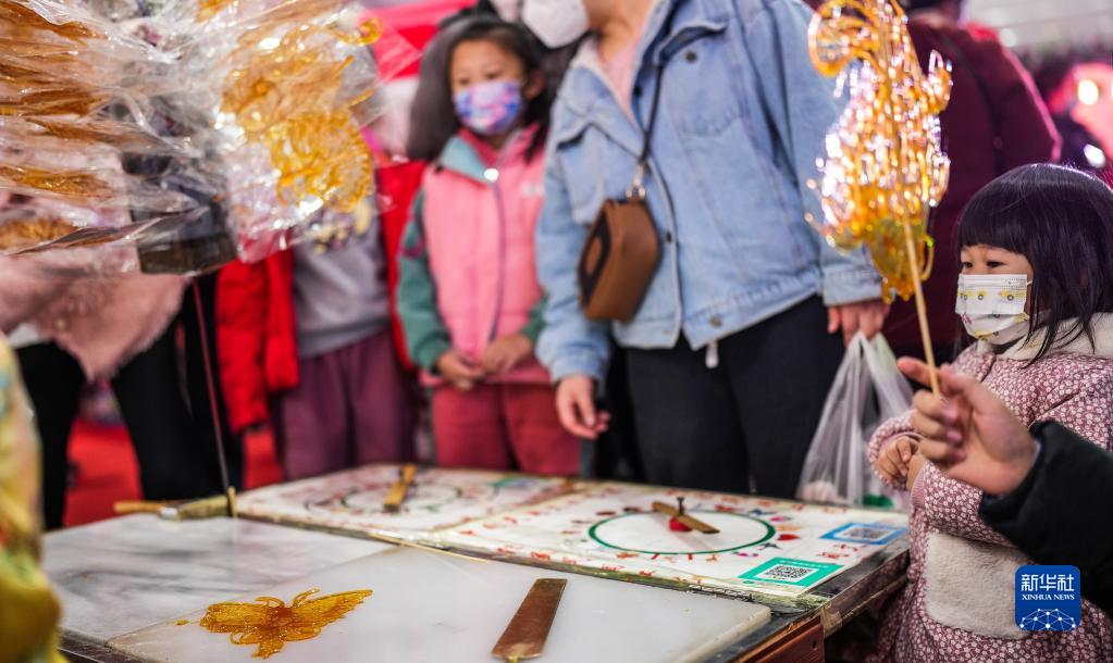 在貴陽(yáng)市南明區蘭花廣場(chǎng)年貨節現場(chǎng),小朋友在等待糖畫(huà)制作完成(1月14日攝)。