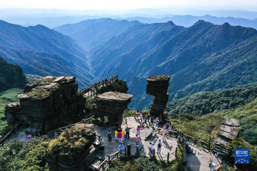 游客在貴州省銅仁市梵凈山景區旅游觀(guān)光(2021年9月27日攝,無(wú)人機照片)。新華社記者 楊文斌 攝