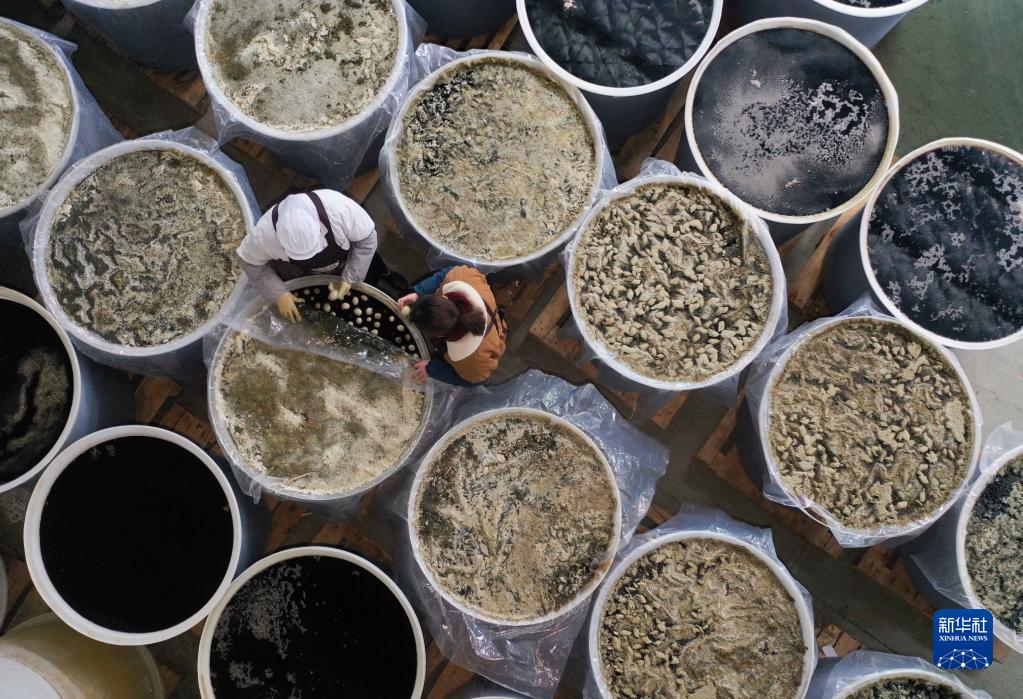 1月16日,工人在貴州省黔東南苗族侗族自治州三穗縣一家食品加工廠(chǎng)檢查皮蛋質(zhì)量(無(wú)人機照片)。