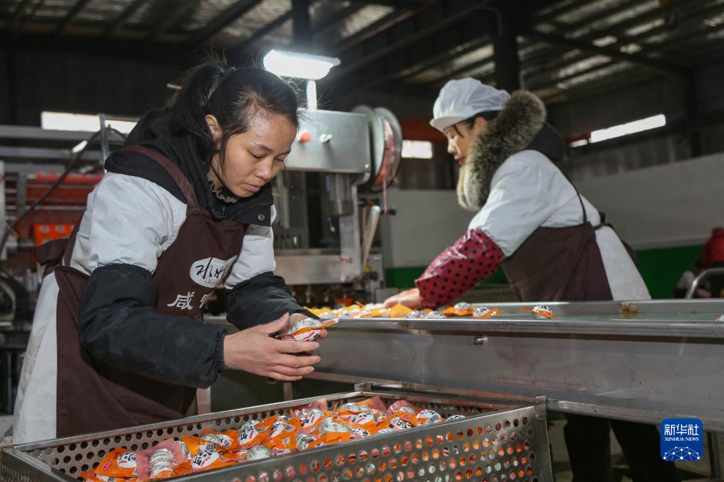 1月16日,工人在貴州省黔東南苗族侗族自治州三穗縣一家食品加工廠(chǎng)檢查咸鴨蛋包裝質(zhì)量。