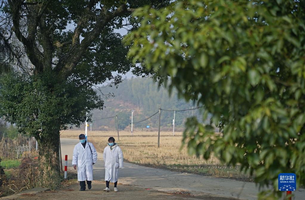 在江西省豐城市鐵路鎮楊坊村,村醫徐秋生(左)與女兒一同前往行動(dòng)不便的徐全香老人家中巡診(1月11日攝)。