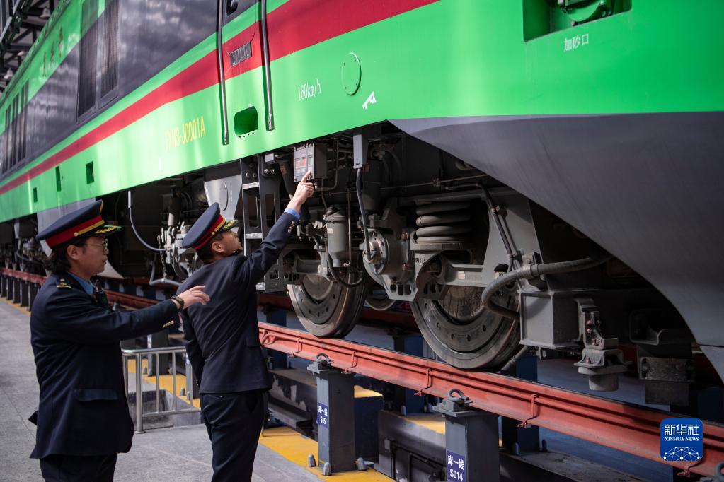 在拉薩機輛整備中心,黃起崗(右)和同事對動(dòng)車(chē)組進(jìn)行走行部檢查(1月11日攝)。