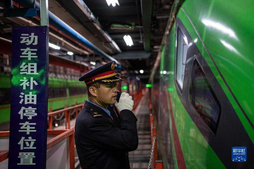在拉薩機輛整備中心,黃起崗在和一體化調度中心確認動(dòng)車(chē)組補油位置(1月11日攝)。