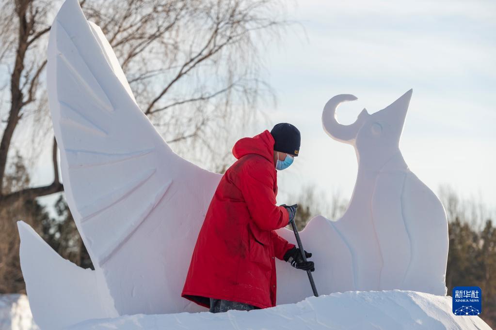 1月16日,在哈爾濱太陽(yáng)島雪博會(huì )園區,參賽選手在進(jìn)行雪雕創(chuàng )作。