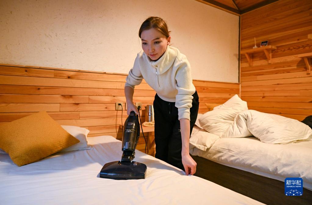 新疆阿勒泰地區禾木村的一名民宿經(jīng)營(yíng)主在整理客房(1月7日攝)。