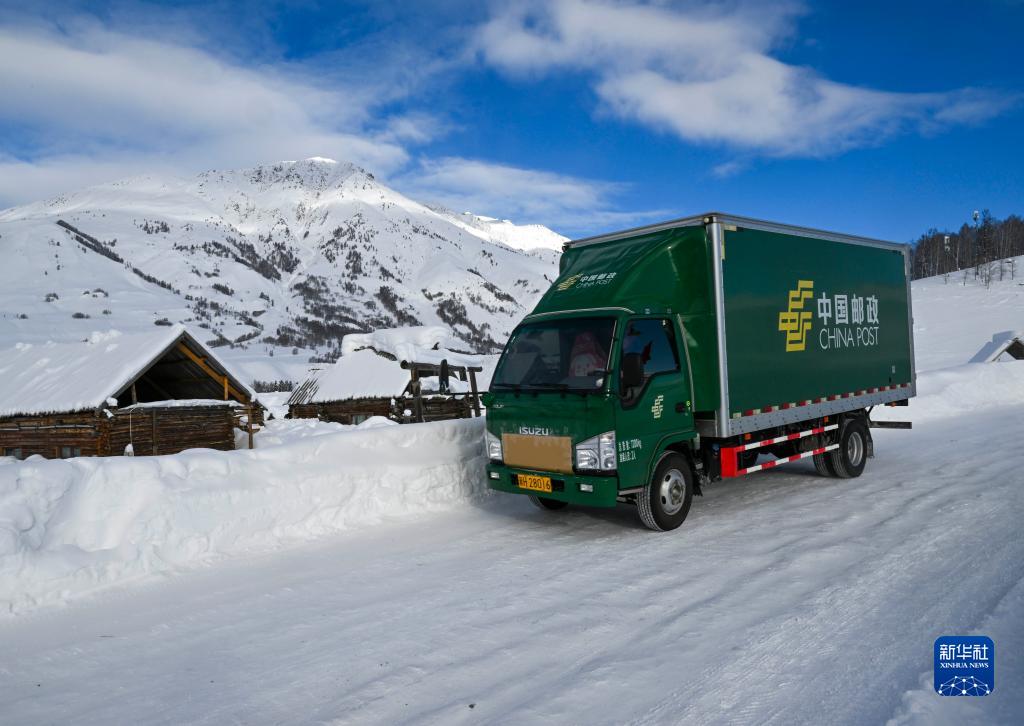 一輛郵政快遞車(chē)駛入新疆阿勒泰地區禾木村(1月14日攝)。