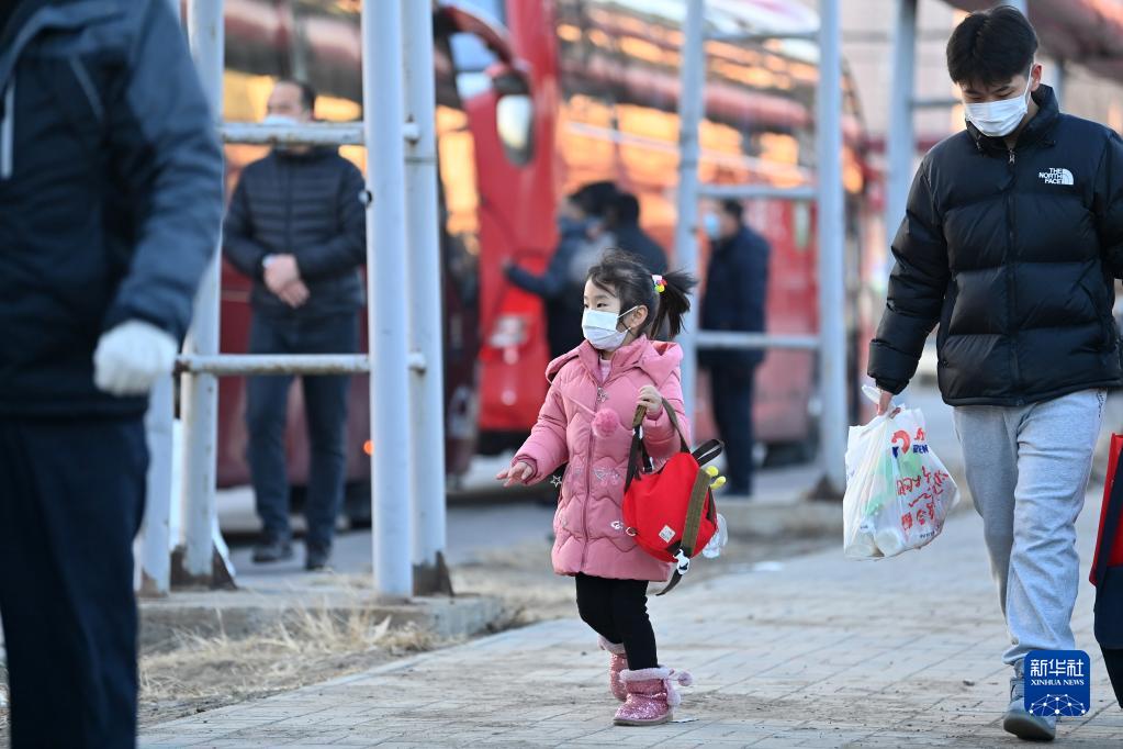 1月16日,返鄉工人帶著(zhù)小孩在天津市北辰區宜興埠鎮準備登車(chē)返鄉。