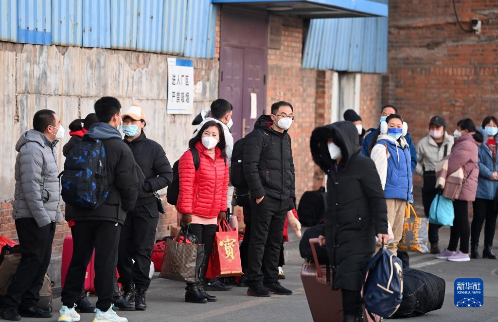 1月16日,返鄉工人在天津市北辰區宜興埠鎮等待車(chē)輛到達。