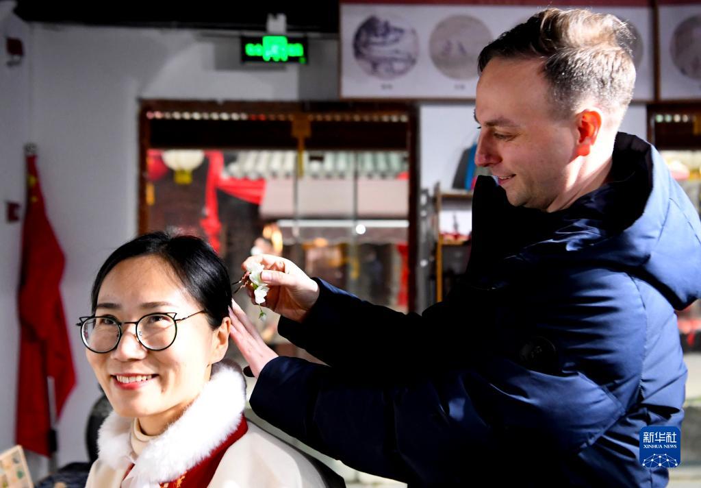 1月13日,在洛陽(yáng)市洛邑古城一家非遺體驗館內,喬丹為妻子范夢(mèng)佳佩戴簪花。