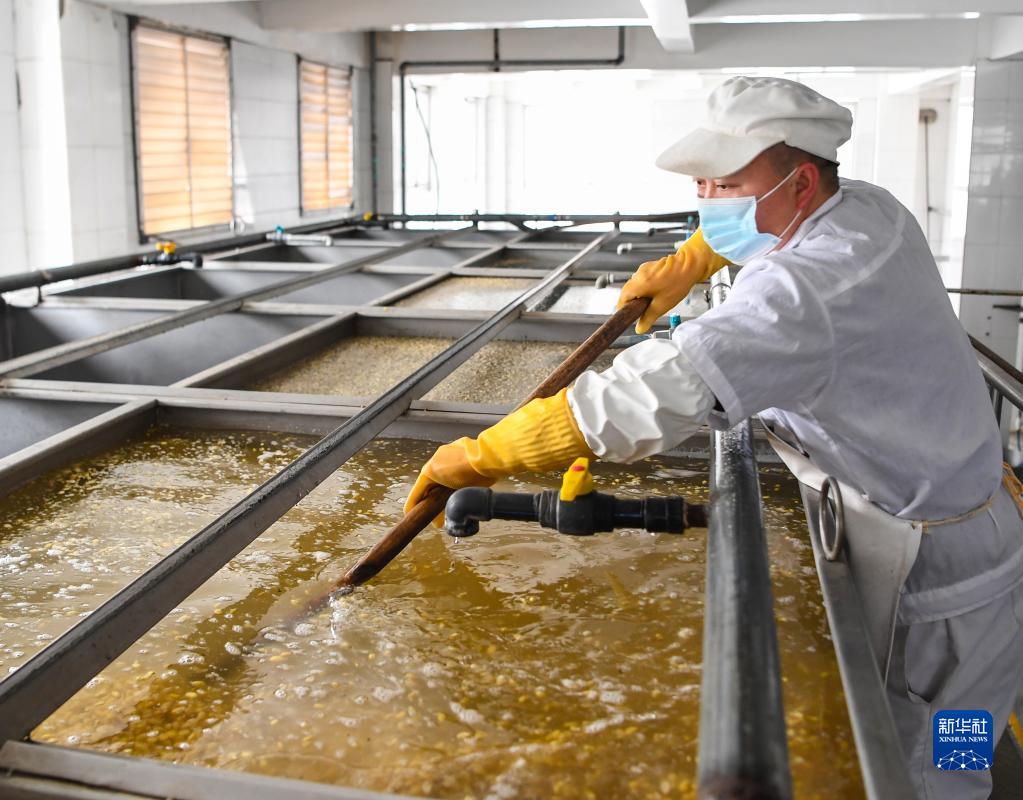 1月16日,陜西延安甘泉縣一家食品公司的工作人員在車(chē)間浸泡大豆。