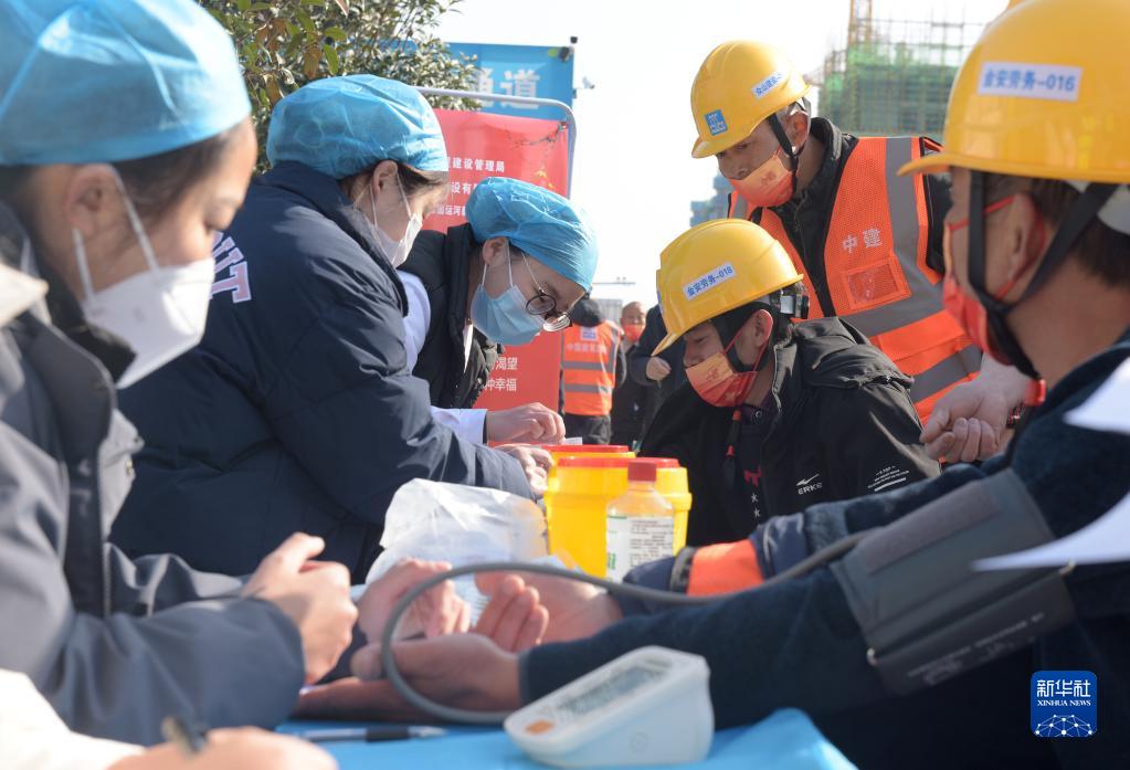 1月16日,醫護人員為即將返鄉的中建四局六公司的工人進(jìn)行健康體檢。