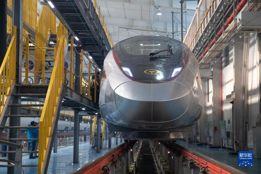 1月16日,工作人員在中國鐵路哈爾濱局集團有限公司哈爾濱動(dòng)車(chē)段檢修車(chē)間內準備檢查入庫的CR400BF-GZ型復興號高寒智能動(dòng)車(chē)組。