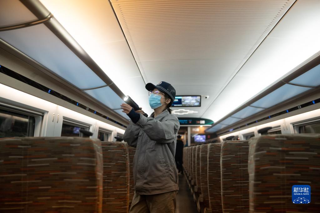 1月16日,工作人員在CR400BF-GZ型復興號高寒智能動(dòng)車(chē)組車(chē)廂內進(jìn)行作業(yè)。