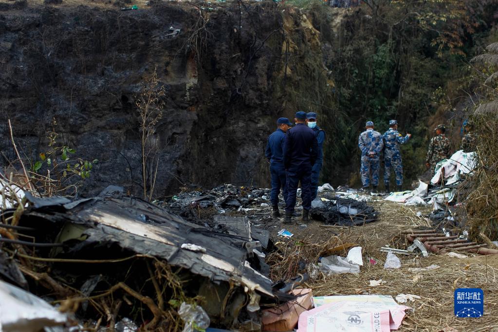 1月16日,救援人員在尼泊爾博克拉地區墜機現場(chǎng)工作。