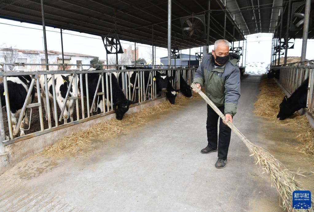1月16日,陜西省西安市臨潼區神東村村民在奶牛養殖基地打掃。