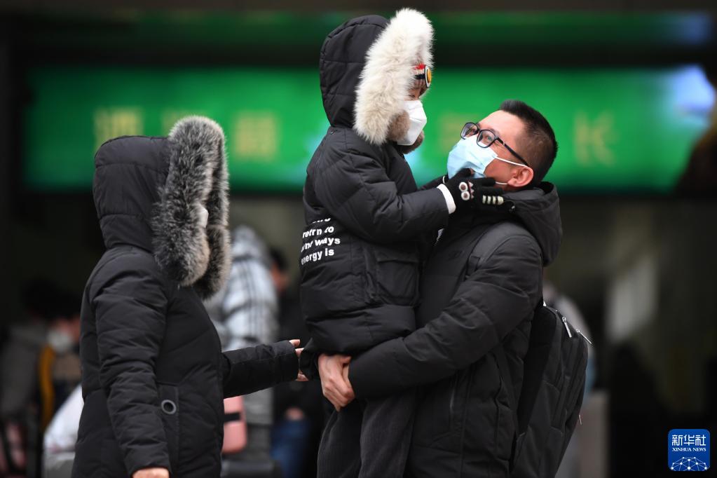 1月16日,在蘭州火車(chē)站西出站口,一位女士帶著(zhù)孩子與丈夫重逢,丈夫抱起孩子,其樂(lè )融融。新華社記者 陳斌 攝