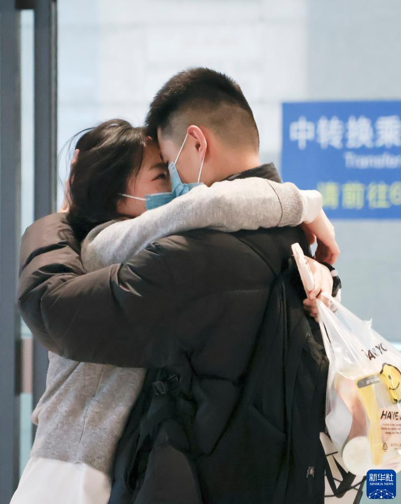 1月13日,在貴陽(yáng)北站出站口,白先生接到從深圳前來(lái)的女友后相互擁抱。新華社記者 劉續 攝
