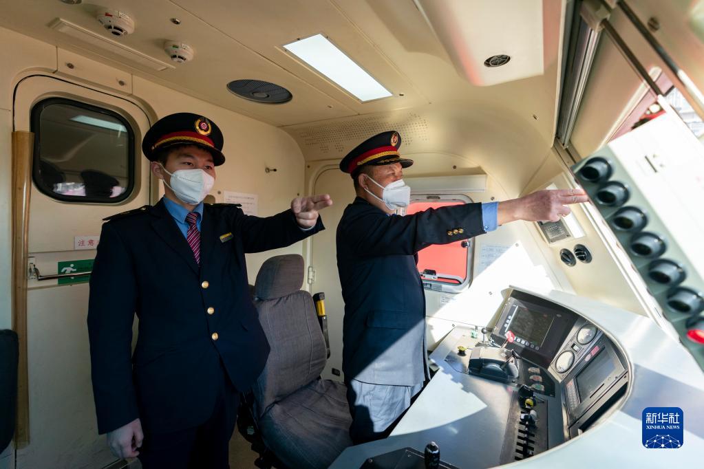 1月15日,丁建華(右)和徒弟姜庭瑞在司機室內按規范做手勢準備行車(chē)。