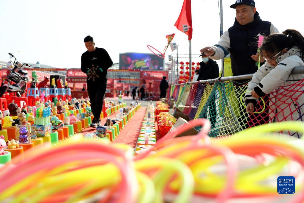 1月17日,市民帶著(zhù)孩子在山東省青島西海岸新區一處集市玩套圈。