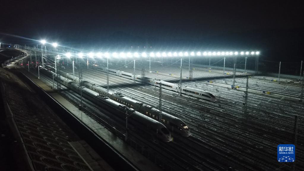 1月17日,列車(chē)準備進(jìn)入長(cháng)沙西動(dòng)車(chē)運用所(無(wú)人機照片)。
