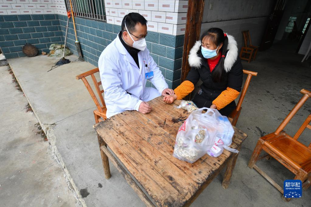 1月17日,在長(cháng)沙市望城區喬口鎮盤(pán)龍嶺村,醫護人員為有不適癥狀的村民把脈。