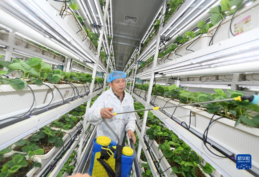 1月17日,農技人員在浙江省建德市楊村橋鎮智能草莓工場(chǎng)內給草莓噴施葉面肥。
