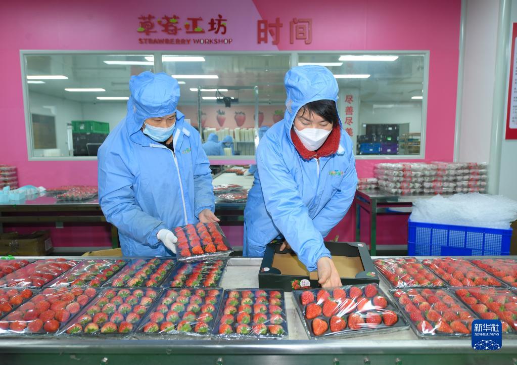 1月17日,浙江省建德市楊村橋鎮一家企業(yè)的工作人員在生產(chǎn)線(xiàn)上包裝草莓。