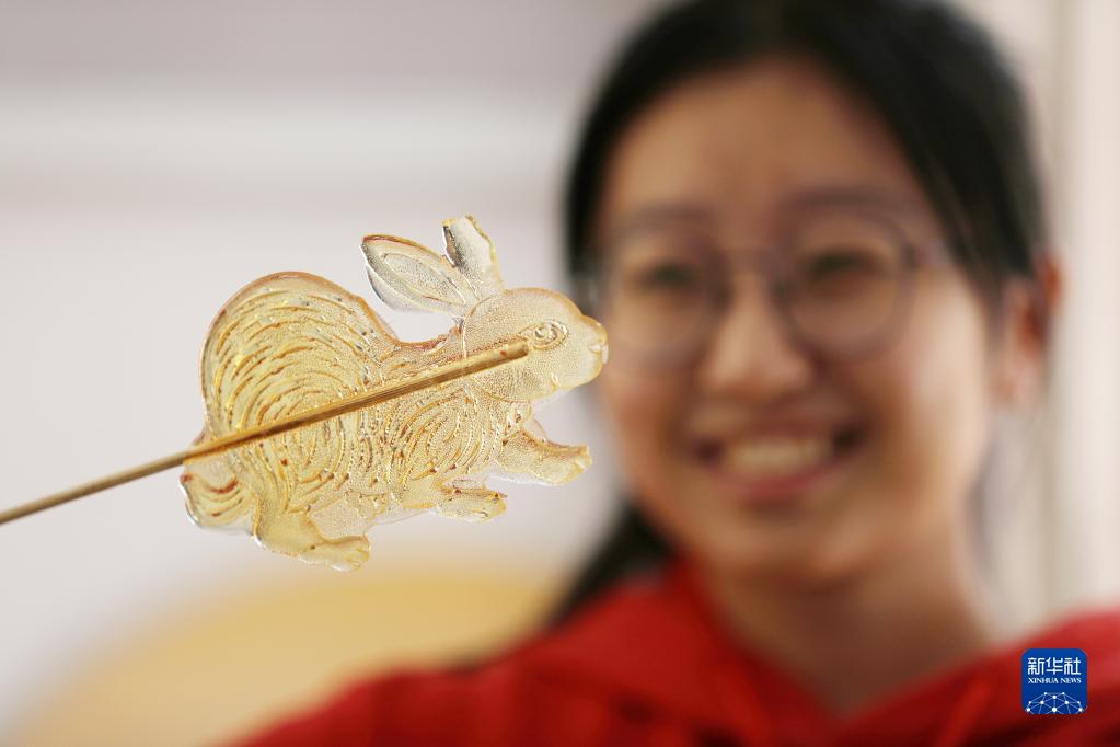 1月17日,在山東省臨沂市郯城縣郯城街道東城社區婦女兒童活動(dòng)中心,一個(gè)女孩展示兔子糖畫(huà)。