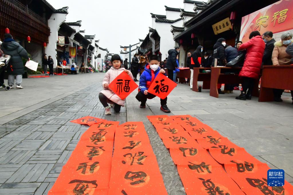 1月17日,在浙江省建德市梅城鎮南門(mén)街,孩子們展示“?!弊趾痛郝?lián)。