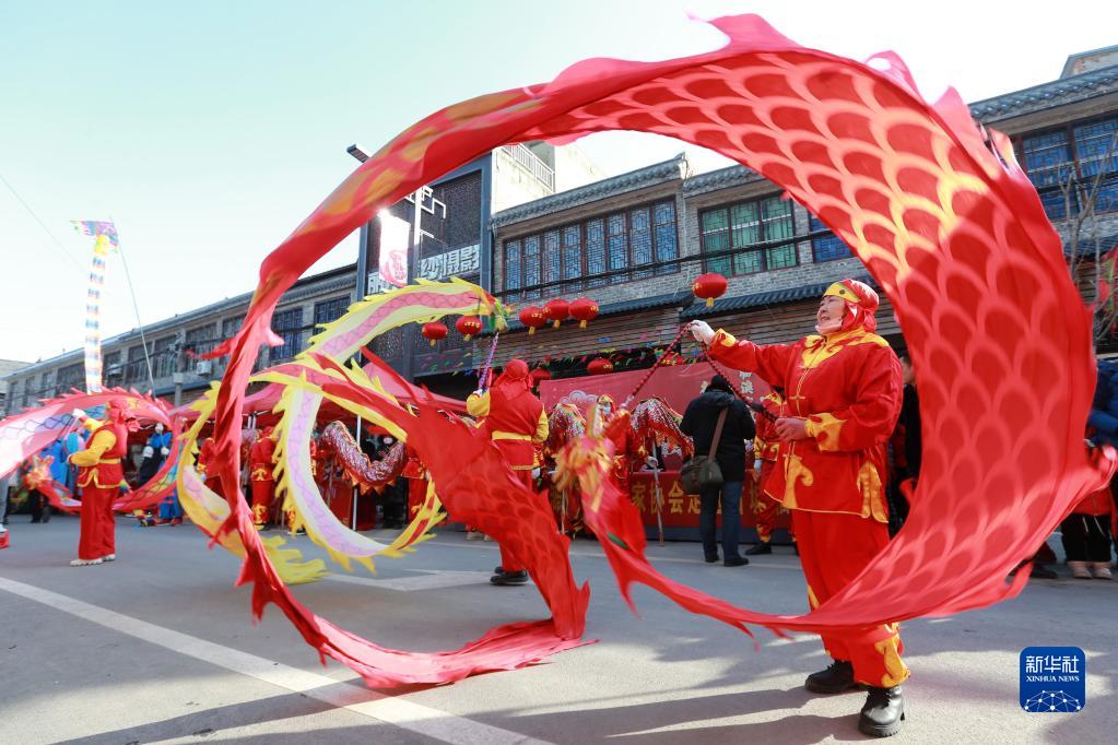 1月17日,在安徽省淮北市濉溪縣臨渙鎮,民俗藝人在表演健身龍。