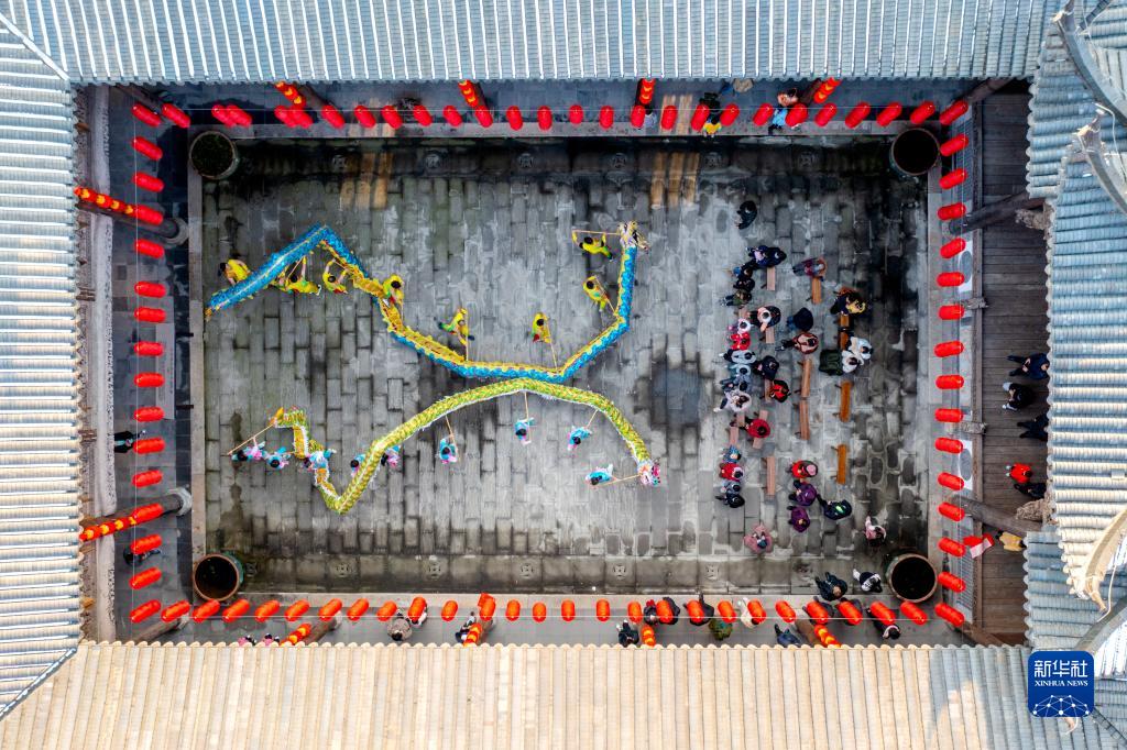 1月17日,在浙江省湖州市長(cháng)興縣李家巷鎮石泉村文化禮堂內,村民在欣賞非遺節目——鴛鴦龍(無(wú)人機照片)。